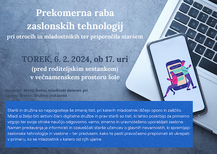V torek, 6. februarja, smo obiskali Osnovno šolo Slave Klavore v Mariboru, kjer smo izvedli predavanje o prekomerni in škodljivi rabi zaslonov. Predavanje, ki je bilo organizirano v sklopu roditeljskih sestankov, je bilo v prvi vrsti namenjeno staršem, udeležili pa so se ga tudi nekateri strokovni delavci šole.
